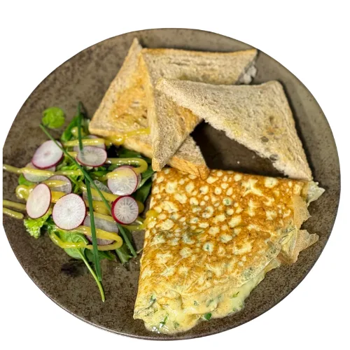 Oua / Sare / Piper / Smantana de gatit / marar fresh / patrunjel fresh / cascaval emmantaler / Ulei floarea soarelui / Mix de salata / Ridiche / Paine cu maia /