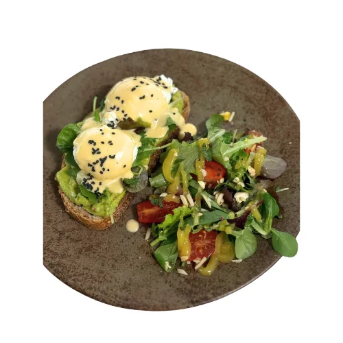Oua / Otet / Sare / Unt / avocado cuburi / mix seminte / Lamaie / Piper / Usturoi granulat / Paine cu maia / Mix de salata / Rosii cherry / Susan / Ulei floarea soarelui / Mustar / Miere /